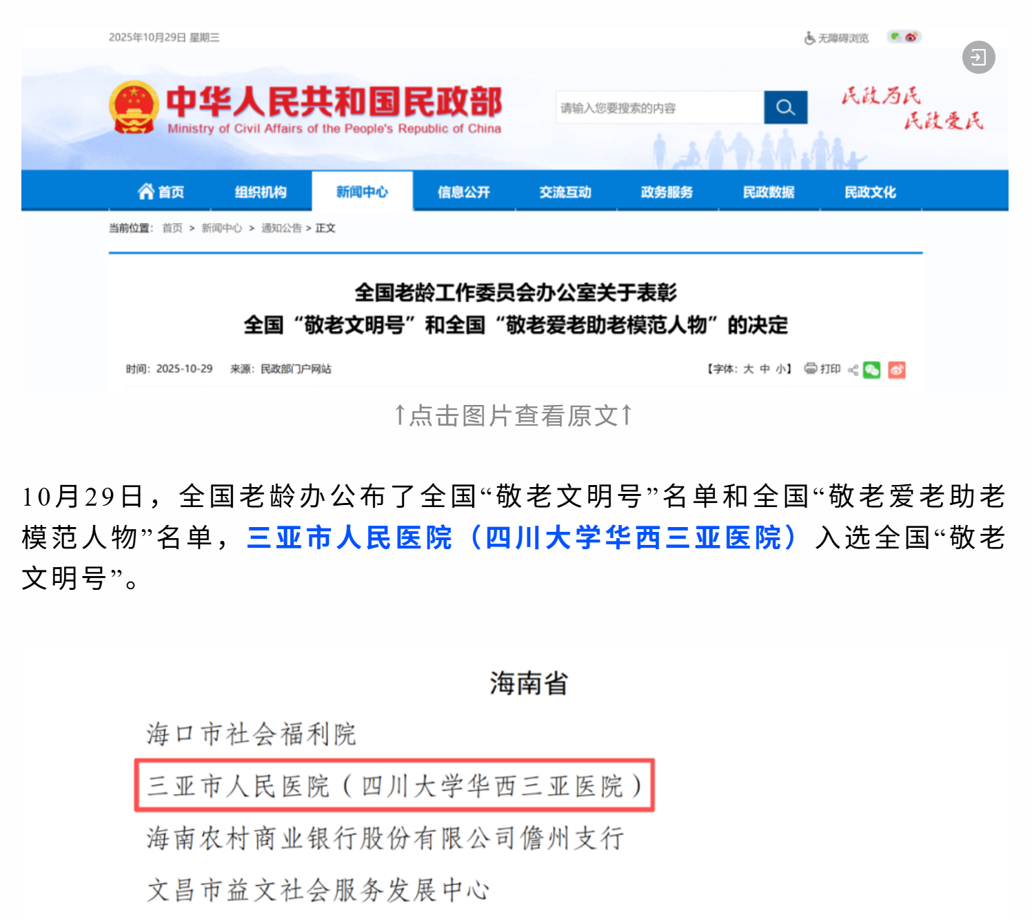 ▲三亚市人民医院在老年健康服务领域实现体系化发展,获评全国“敬老文明号”