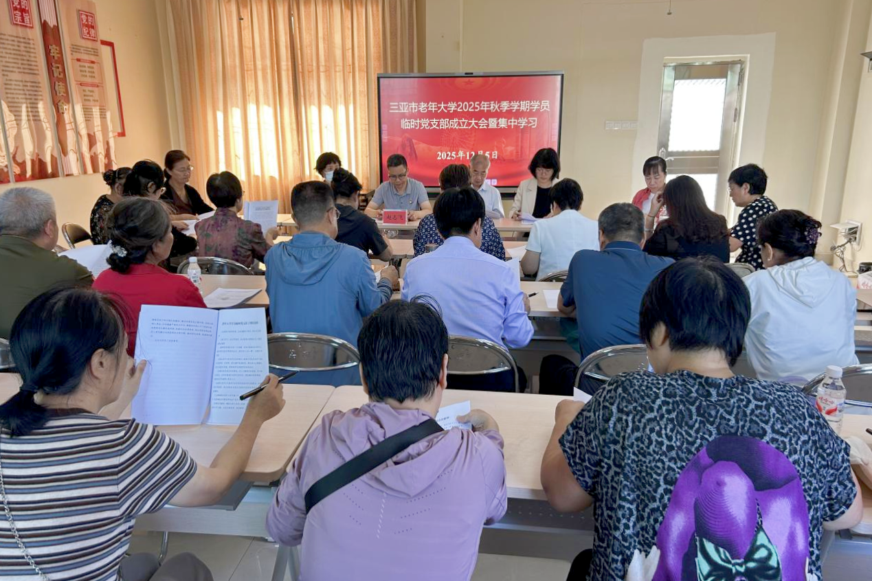 为加强老年学员党员教育管理,凝聚学员党员力量,推动老年大学党建工作与教学活动深度融合,12月5日上午,三亚市老年大学2025年秋季学期学员临时党支部成立会议暨首次集中学习活动在市老干部活动中心“鹿城红霞”南海银辉党建共享阵地举行。市老年大学相关负责人、市党群服务中心相关负责人出席会议,各学员临时党支部支委及党员代表共30余人参加会议。
