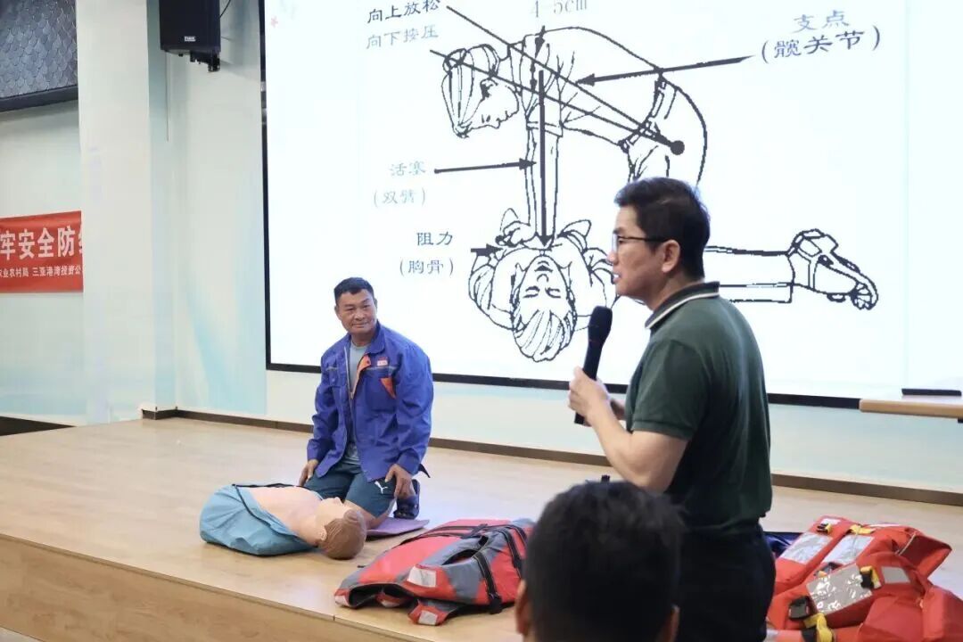 培训现场,讲师聚焦渔民实际需求,讲解台风预警识别、渔船设备维护、落水救援等核心内容,结合近年海上事故案例剖析风险点,并现场演示救生衣穿戴、灭火器使用、心肺复苏等应急技能操作技巧;实操演练环节,讲师逐一点评纠错学员应急动作,确保“人人会应急、个个能操作”,参训学员表示:“通过今天学习,对设备检查和应急技能等规范流程更加熟悉,以后出海心里都踏实了。”针对崖州区海域特点,讲师还从海域养殖产业现状、绿色养殖核心技术、深海养殖产业链布局、生态可持续实践及市场拓展等五大角度切入,解析崖州区循环水养殖和浅海网箱生态养殖的区位与资源优势,指导学员科学控制养殖密度、调节水质,减少病害风险。
