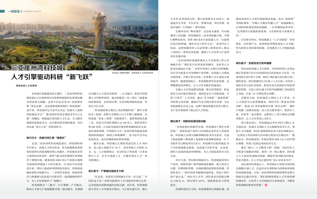 走进三亚崖州湾科技城高新区,国家级科研平台林立,高端人才纷至沓来。作为南繁种业和深海科技两大国家战略的核心承载区,科技城具有得天独厚的自然条件:热带气候为农作物周年育种提供了理想环境,毗邻南海1000米以下深海区域则为深海科研创造了天然实验室。自2019年启动建设以来,园区已建成崖州湾国家实验室、国家耐盐碱水稻技术创新中心、三亚海洋实验室、海南省海洋立体观测与信息重点实验室等一批高能级科研平台,为人才发展提供了广阔舞台。