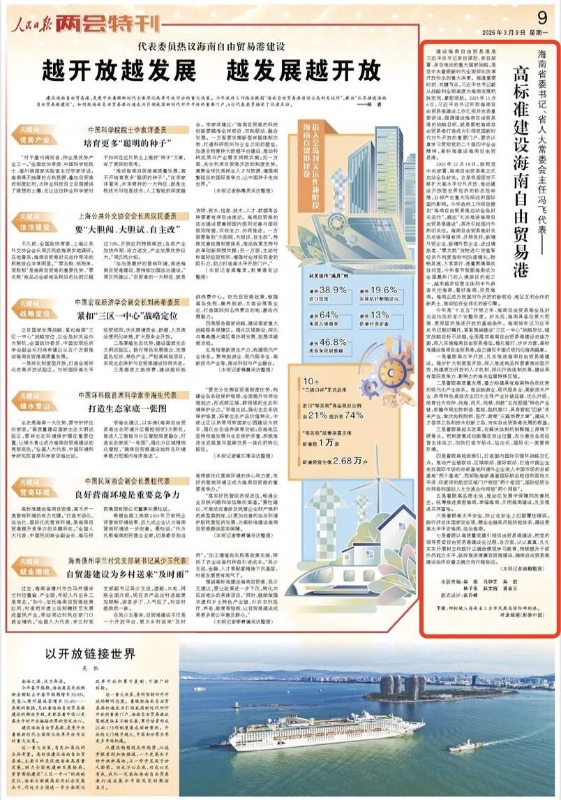 3月9日,《新华每日电讯》刊发文章《海南省委书记、省人大常委会主任冯飞:努力把海南自由贸易港打造成为引领我国新时代对外开放的重要门户》版面图及全文如下: