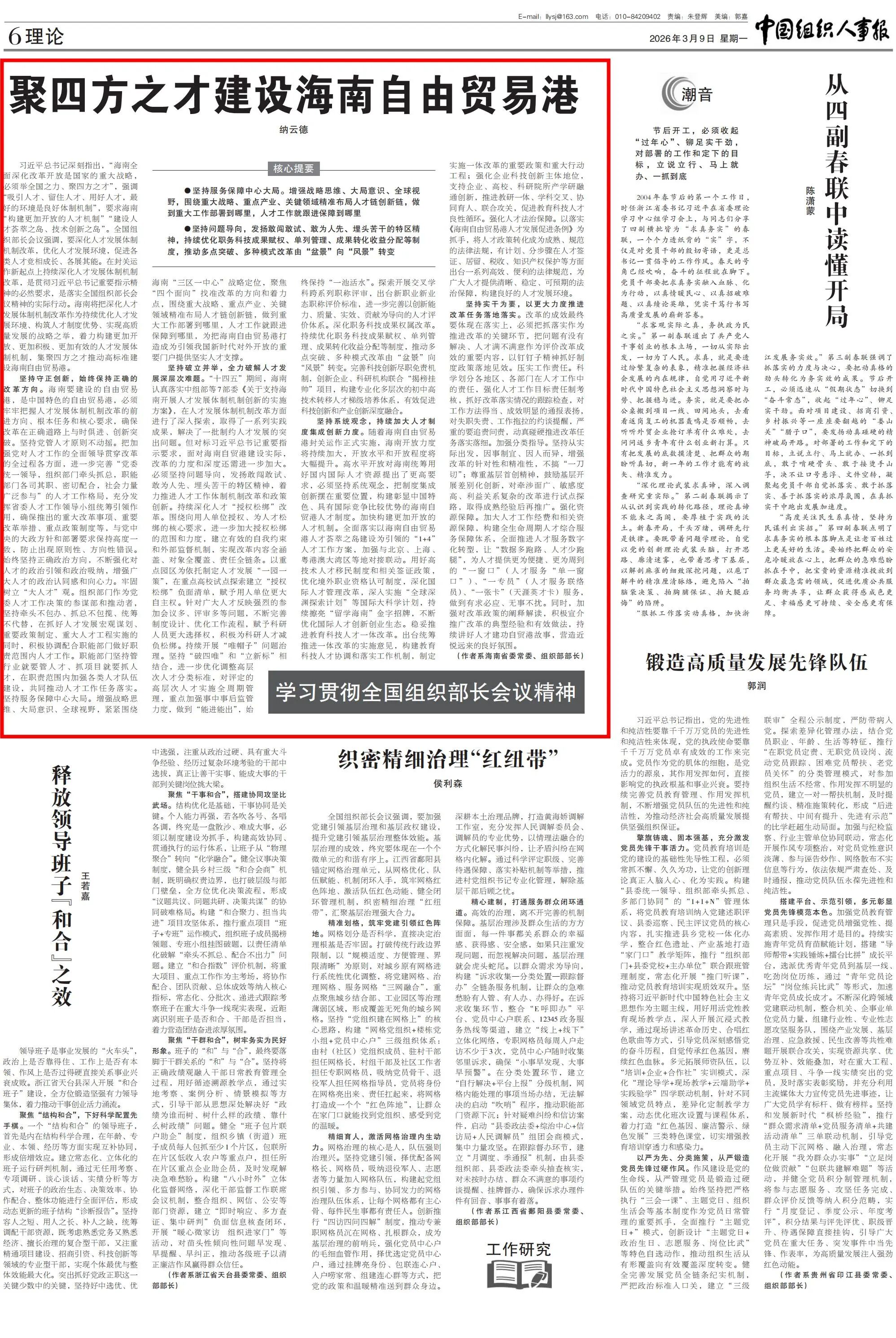 3月9日,《中国组织人事报》刊发文章《海南省委常委、组织部部长纳云德:聚四方之才建设海南自由贸易港》版面图及全文如下: