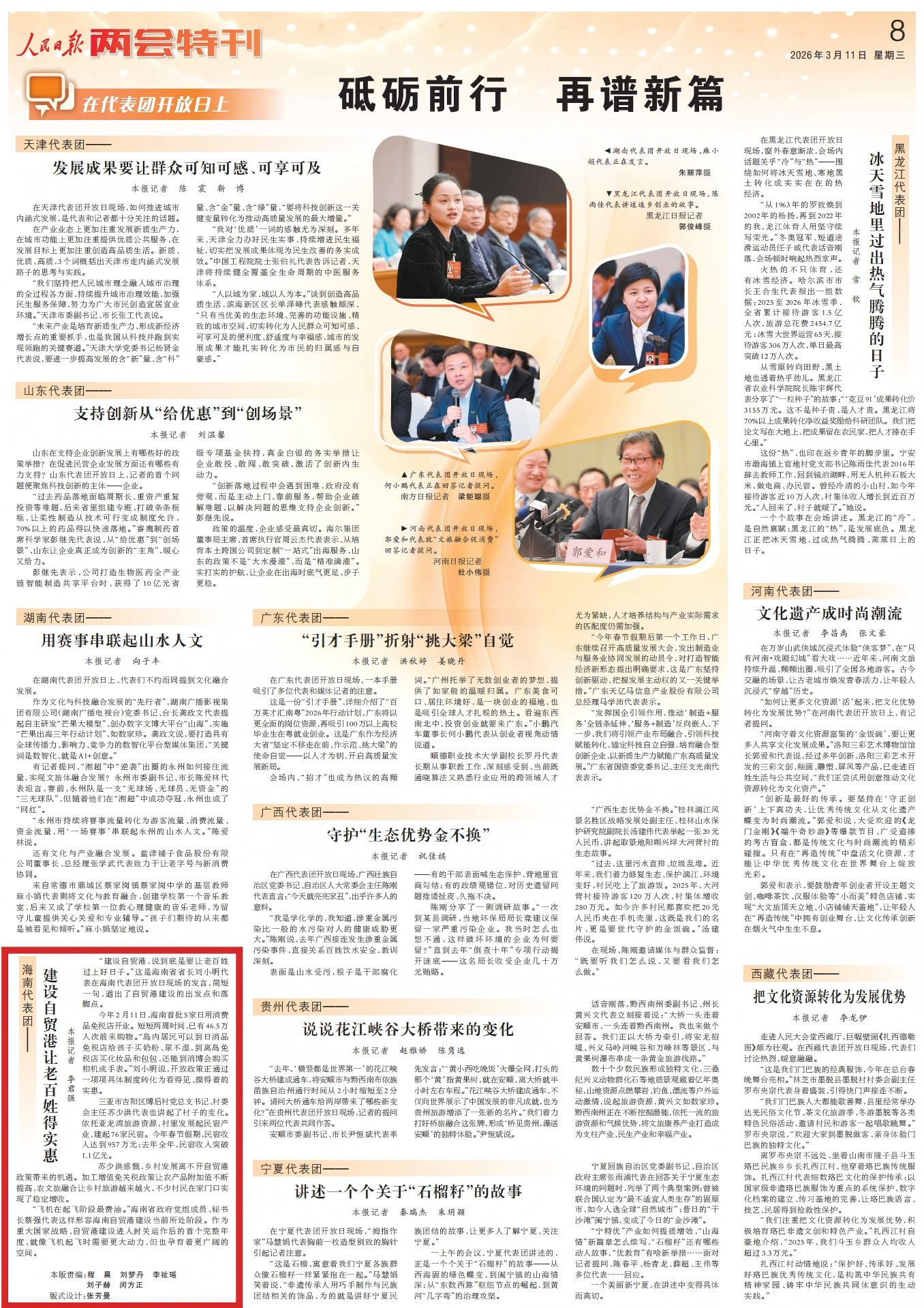 3月11日,人民日报第08版两会特刊以《砥砺前行再谱新篇(在代表团开放日上)》为题刊发文章。其中提到,在海南代表团开放日现场,代表们表示,建设自贸港旨在让百姓得实惠,当前自贸港建设进入开放发展新阶段,前景可期。以下为该版面图及文章全文内容: