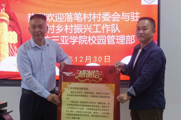 落笔村驻村第一书记、工作队队长李树林表示,此次合作是优势互补的有益尝试,后续将细化措施,推动合作共识转化为实际成效,真正把“资源清单”变成“幸福清单”。三亚学院代表强调,服务地方发展是高校的社会责任,学校将继续发挥自身优势,努力打造校村共建助推乡村振兴的示范样板。落笔村委会向三亚学院赠送“情系落笔暖民心扶危济困显担当”锦旗与感谢信,标志着校地协同发展的新篇章正式开启。
